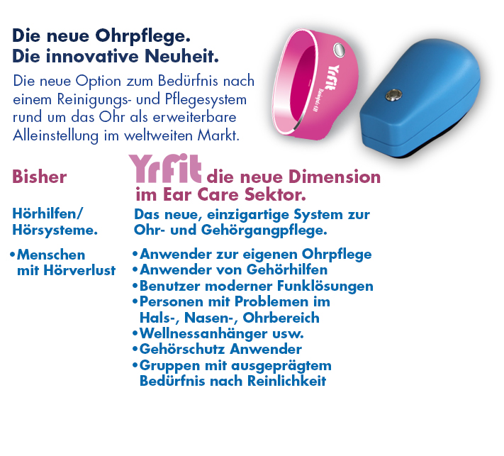 Neu, einfach und pflegend. Grundlegend neue Anwendung für Hygiene, Pflege, Prophylaxe und ganzheitliche Ansprüche. Neues frequenzgesteuertes Gehörgang Pflegesystem für eine regelmässige Selbstanwendung zur berührungslosen Als neue Lösung für die sichere Ohrpflege, basierend auf der besonderen druck-neutralen ORIS Funktion (Organ Reso- nance Impulse Stimulation), schliesst ein solches Sytem eine signifikante Lücke im weltweiten Wellness und Healthcare Markt. Gilt auch als Zusatzgerät für Gehörhilfen- träger und Gehörschutz Anwender. Das System ist für verschiedene Modelle für